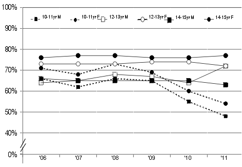 Those 10-15 year olds who report drinking less than one litre of water 'yesterday' 2006-2011