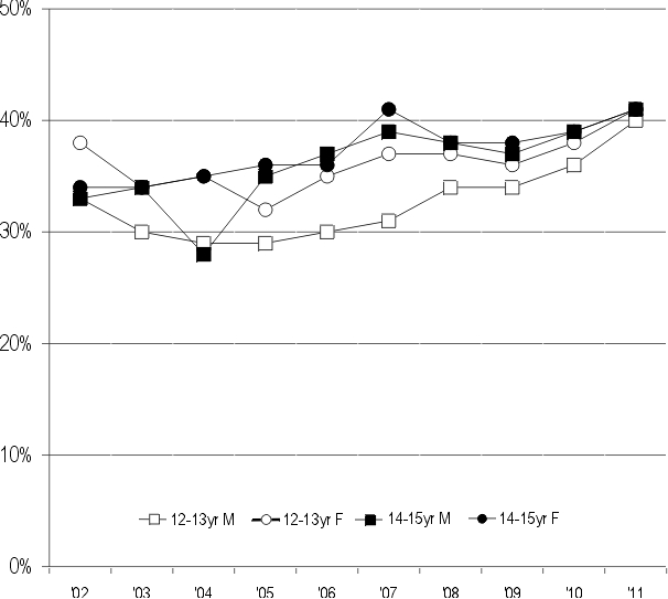 Chart 2. Results from 2002-2011 from 211,503 12-15 year olds who report enjoying ‘most / all’ school lessons